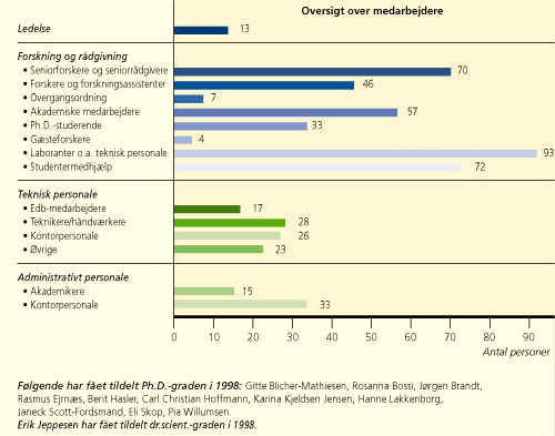 DMUs medarbejderstab er vokset betragteligt i tiåret og med en stigning der er større end væksten i økonomien umiddelbart skulle tilsige. I 1998 udgjorde lønudgifterne 62% af DMUs samlede driftsudgifter. Resultatet er at DMUs medarbejderstab er vokset fra 200 årsværk i 1989 til ved udgangen af 1998 at udgøre 442 årsværk.