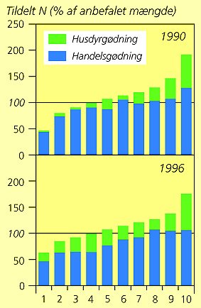 Der finder overgødskning sted på marker der kun får kunstgødning; men problemet er størst på de ejendomme der har flest husdyr.