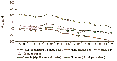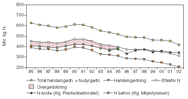 Forbrug af kvælstofgødning Udviklingen i total og effektivt tildelt kvælstof, afgrødernes kvælstofnorm og handelsgødningskvælstof for hele landet i perioden 1985 til 2002. (Der er indregnet 2 % stigning i nyttevirkningen af husdyrgødningskvælstof pr. år fra 1985 til 1993; fra 1994-1996 er nyttevirkningen fastholdt på 42 %, mens den steg til 44 % i 1997 og 46 % i 1998 og faldt til 45 % i 1999-2000 og steg til 46 % i 2002. |
