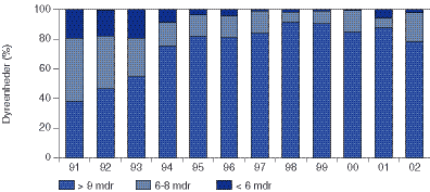 skulle være opfyldt med udgangen af 1994. Fra 1998 til 2002 faldt andelen