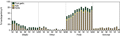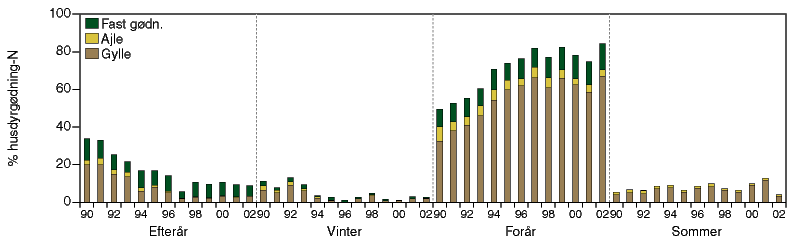 Udbringningstider for husdyrgødning Landbrugspraksis for udbringningstidspunkterne i landovervågningsoplandene for husdyrgødning er vist i figur 4.5 for årene 1990-2002. Opgørelsen registrerer den udbragte husdyrgødning eksklusiv den mængde, der efterlades på marken ved afgræsning. Det ses, at den største husdyrgødningsmængde udbringes om foråret. Således er forårs- og sommerudbringningen steget fra 55 % i 1990 til 88 % i 2002. |